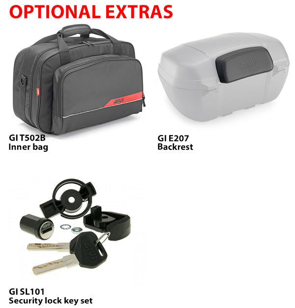 Also available are optional internal bags (T502B), sold separately. The lock is compatible with Givi SL Security Locks, so can be matched to other Givi luggage with the same system with an optional key set.