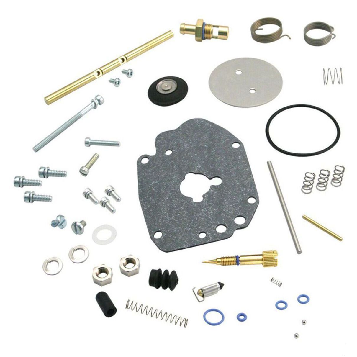 Carburetor master rebuild kit. Fits Super G gas carbs. Includes a body rebuild kit, all new fasteners, springs, idle mixture screw, seat, and needle assembly. When used with a 360° variable position gas inlet fitting, S&S fuel line, part #19-0475, with a 90° formed end must be used and ordered separately.