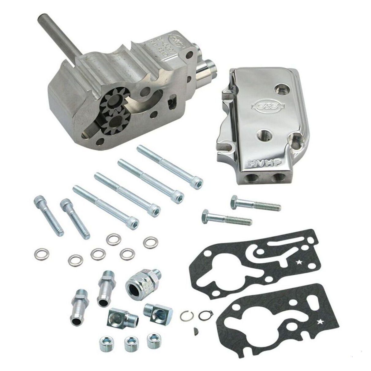 Fitment:1992-'99 HD® Big Twin Features & Benefits: Standard Billet Cover. No thicker than a stock pump. Gears with fewer, but larger teeth provide increased oil volume for both supply and return sides of the pump. Supply gears are 9% wider than stock and standard S&S® oil pumps 28% wider than stock return gears ensure proper crankcase scavenging, reduce drag on the flywheels, and eliminate oil carryover. Increased scavenging capacity results in: Less oil in the crankcase. Less oil carryover. Equipped with a stock length oil pump drive shaft. Includes:Complete oil pump assembly, Oil pump driveshaft, Miscellaneous hose fittings and plugs, Paper gaskets, and Mounting hardware.